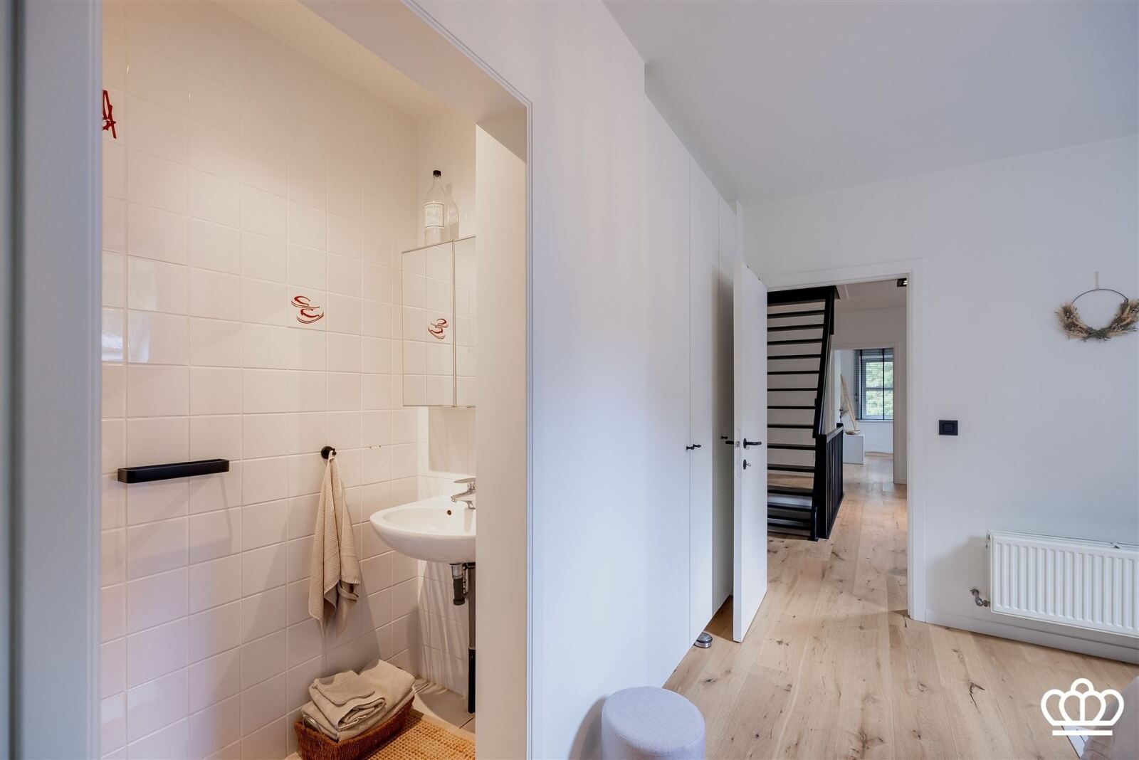 Inkomhal op tegelparket, vestiaireruimte, gastentoilet met handenwasser, aparte bureelruimte met ingemaakte kasten en zijdeur naar buiten. Vanuit de inkomhal toegang tot de zeer ruime leefruimte onderverdeeld in zit- en eetgedeelte. Deze ruimte geniet veel lichtinval door de grote raampartijen die uitgeven op de tuin. Aansluitend ingerichte keuken voorzien van koelkast met vriesvak, Miele combi-oven-micro, aparte Miele microgolfoven, vaatwasser, inductievuur, dampkap en dubbele porseleinen wasbak.