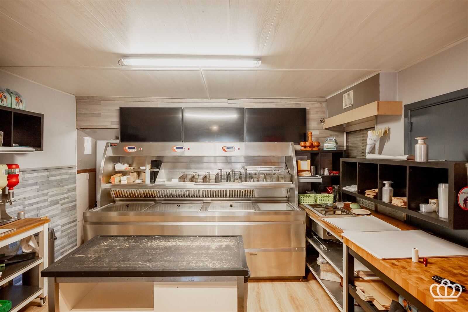 De handelszaak beschikt over een praktische indeling met aparte inkom, wachtruimte en ingerichte frituur. Achteraan bevinden zich een keuken, koelcel en koer. Extra troeven zijn de kelder (met technische installaties), garage en afzonderlijk toilet.